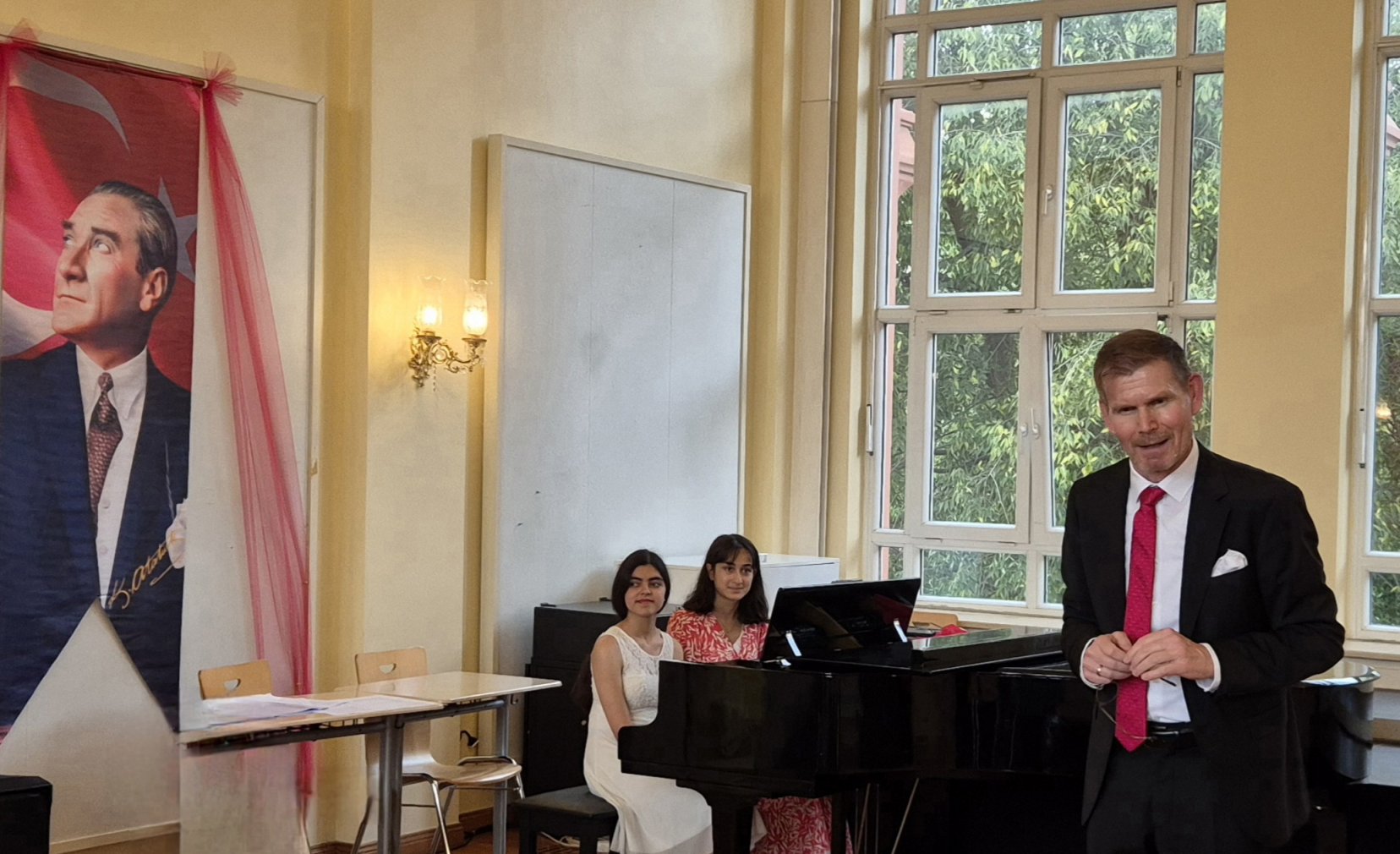 Am nächsten Tag gabe es noch eine Führung mit dem schier allwissenden Architekten Adnan Özerler durch „das neue Istanbul“, die ganze Stadt war aufgrund des Staatsfeiertags zum 102. Jahrestag der Gründung der Republik geschmückt mit unendlich vielen roten türkischen Fahnen und Atatürk-Porträts. Auch die Aula der Deutschen Schule war festlich geschmückt, wo dann noch ein kleines Überraschungskonzert zweier junger Pianistinnen stattfand, die ein Stück des türkischen Komponisten Fazıl Say gekonnt zur Aufführung brachten, sowie ein äußerst interessantes Gespräch über die Türkei aus der Perspektive des DSI-Absolventen, Lehrers und Musikers Oğuz Tarihmen. Das abwechslungsreiche Programm ließ am Ende aber auch noch Zeit für einen gemütlichen Bummel durch die engen Gassen der Stadt, einen Spaziergang über die Galatabrücke am Goldenen Horn oder einen Einkaufsbummel über den Gewürzbasar. Auch der Genuss kulinarischer Köstlichkeiten kam nicht nicht zu kurz.