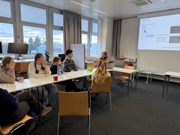 Am 15. Januar machte sich der Biologie-Leistungskurs der Kursstufe 2 von Frau Lohnert auf den Weg nach Heidelberg ins Neuenheimer Feld. Dort erwartete sie Dr. Katrin Schrenk-Siemens, die den Schülern und Schülerinnen einen Einblick in den Berufsalltag einer Wissenschaftlerin gab.