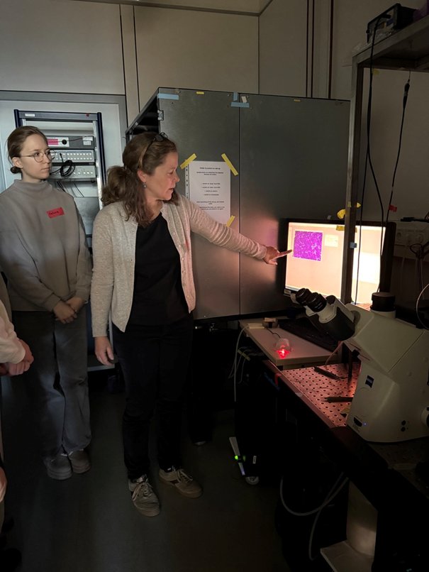 Als letztes Highlight durften die Schülerinnen und Schüler noch Nervenzellen in Aktion sehen. Im sogenannten „Calcium-Imaging“ wird die Aktivität von Nervenzellen durch Fluoreszenz sichtbar gemacht. Die Schülerinnen konnten hier live miterleben, was wir in der Schule meist nur mit Hilfe von Schaubildern darstellen können.