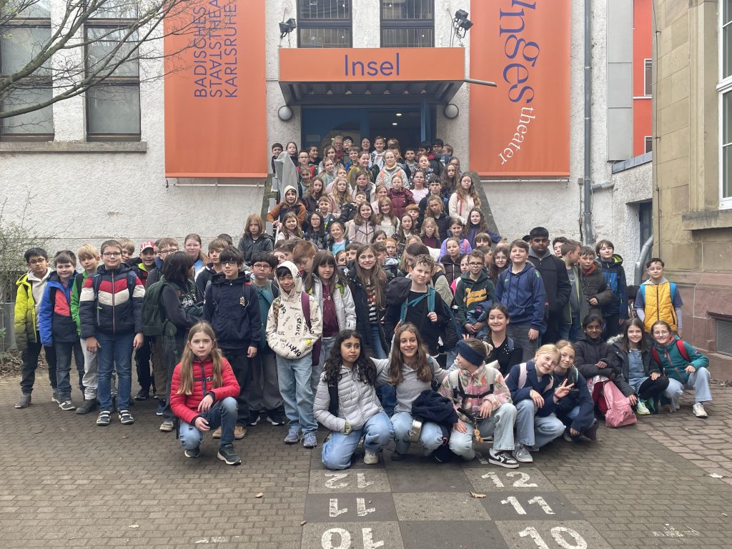 Alle vier fünften Klassen besuchten kurz vor den Osterferien gemeinsam mit ihren Deutschlehrkräften eine Aufführung im Badischen Staatstheater. Auf dem Programm stand „Der satanarchäolügenialkohöllische Wunschpunsch“ von Michael Ende in der Bühnenfassung von Birka Ipsen. Zum Teil wurde der Roman in Auszügen im Unterricht zuvor vorgestellt, sodass die Kinder sich bereits ein eigenes Bild von den Bösewichten und der Macht des satanarchäolügenialkohöllischen Wunschpunschs machen konnten. Dass Filmfassungen sich von Romanvorlagen unterscheiden, war vielen Kindern klar, aber wie setzt man solch einen Roman live auf der Bühne um?